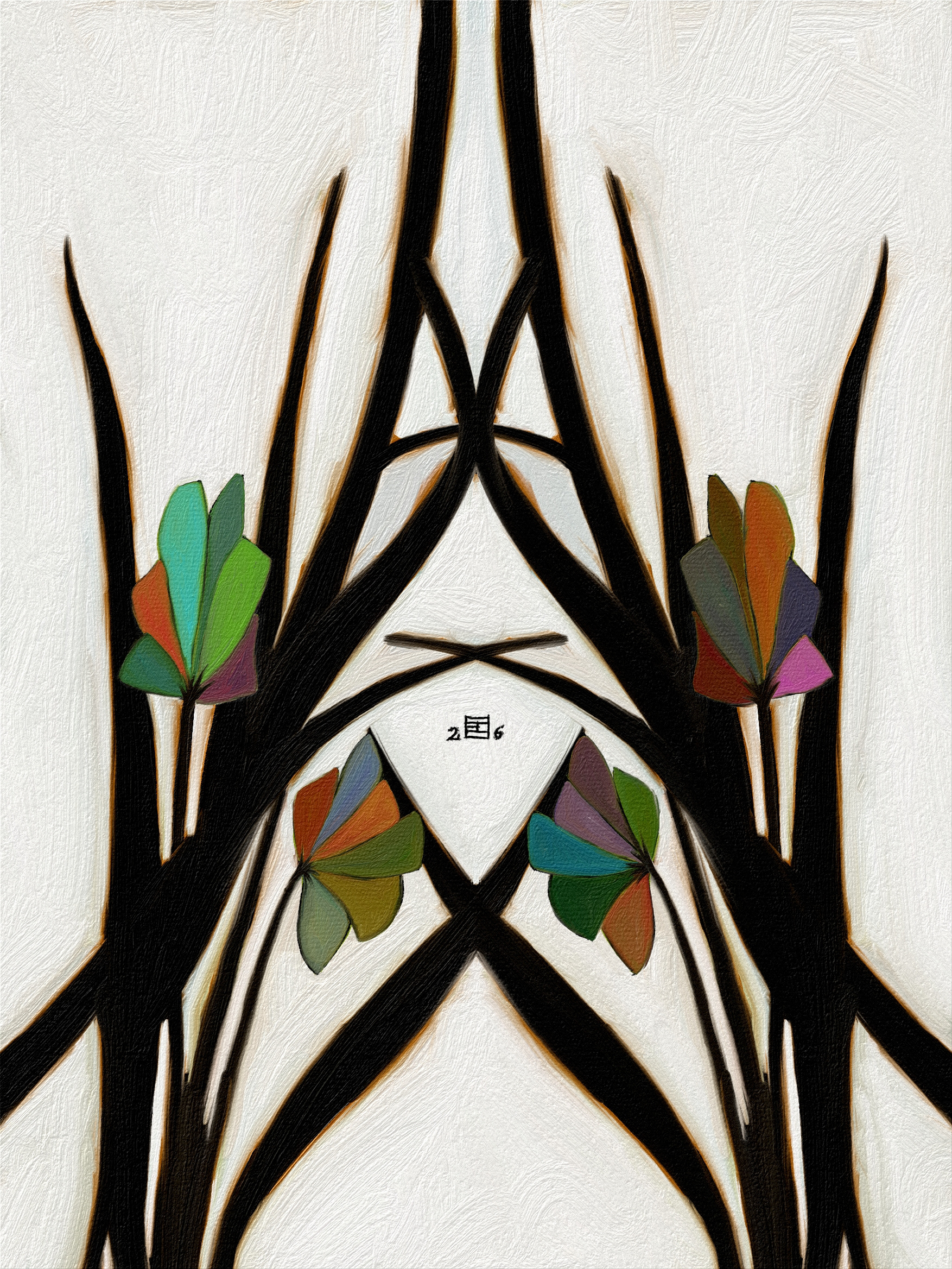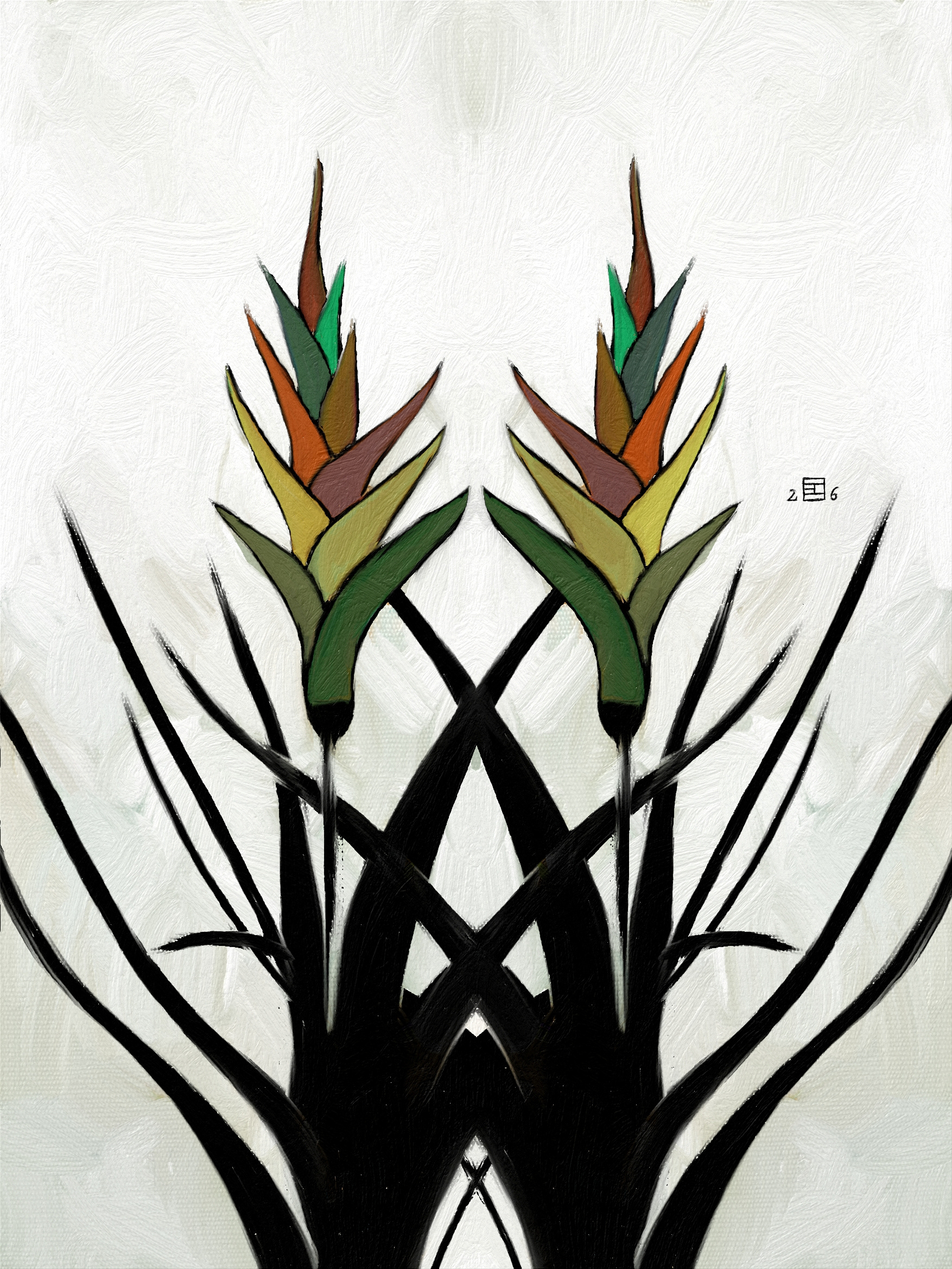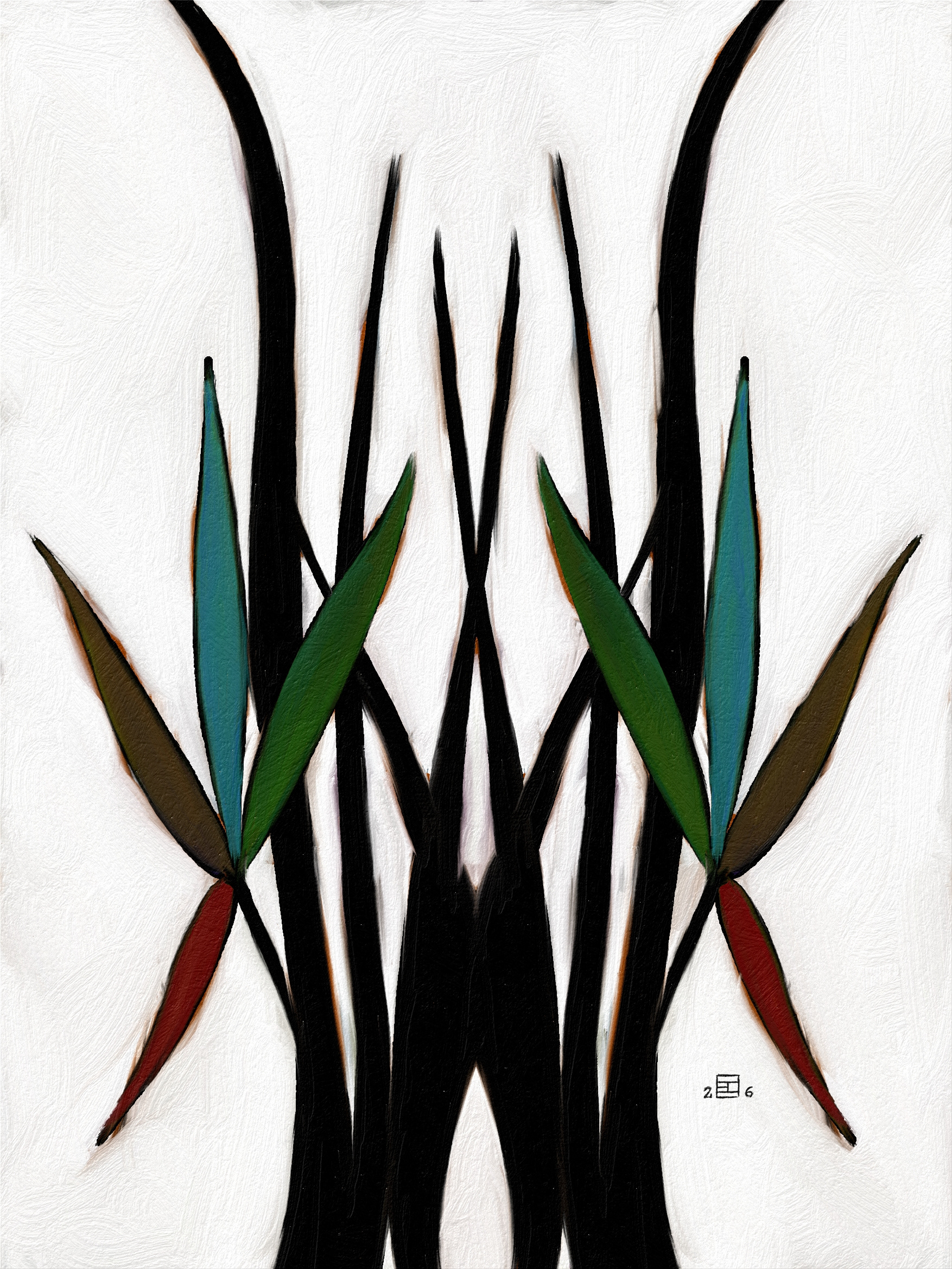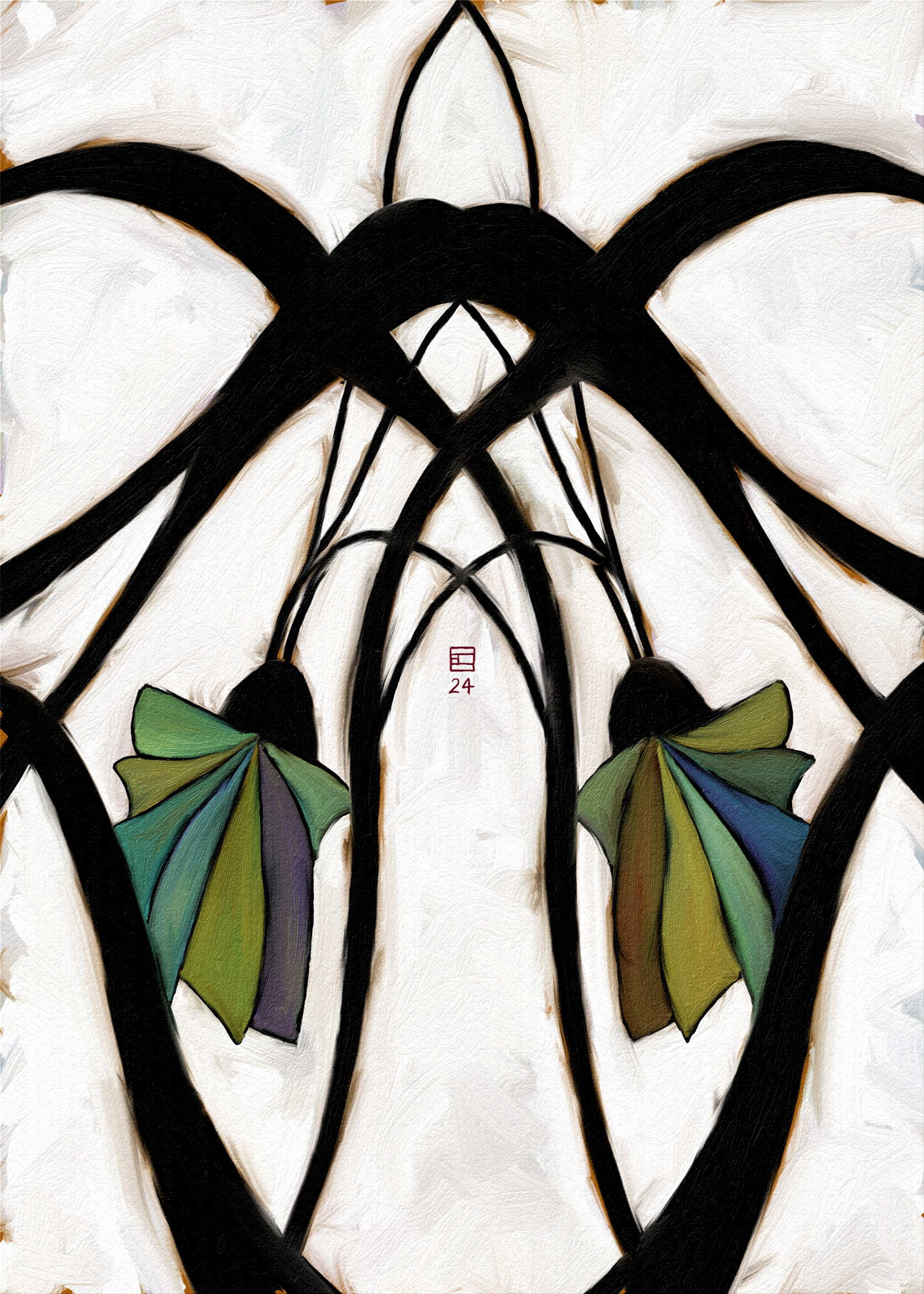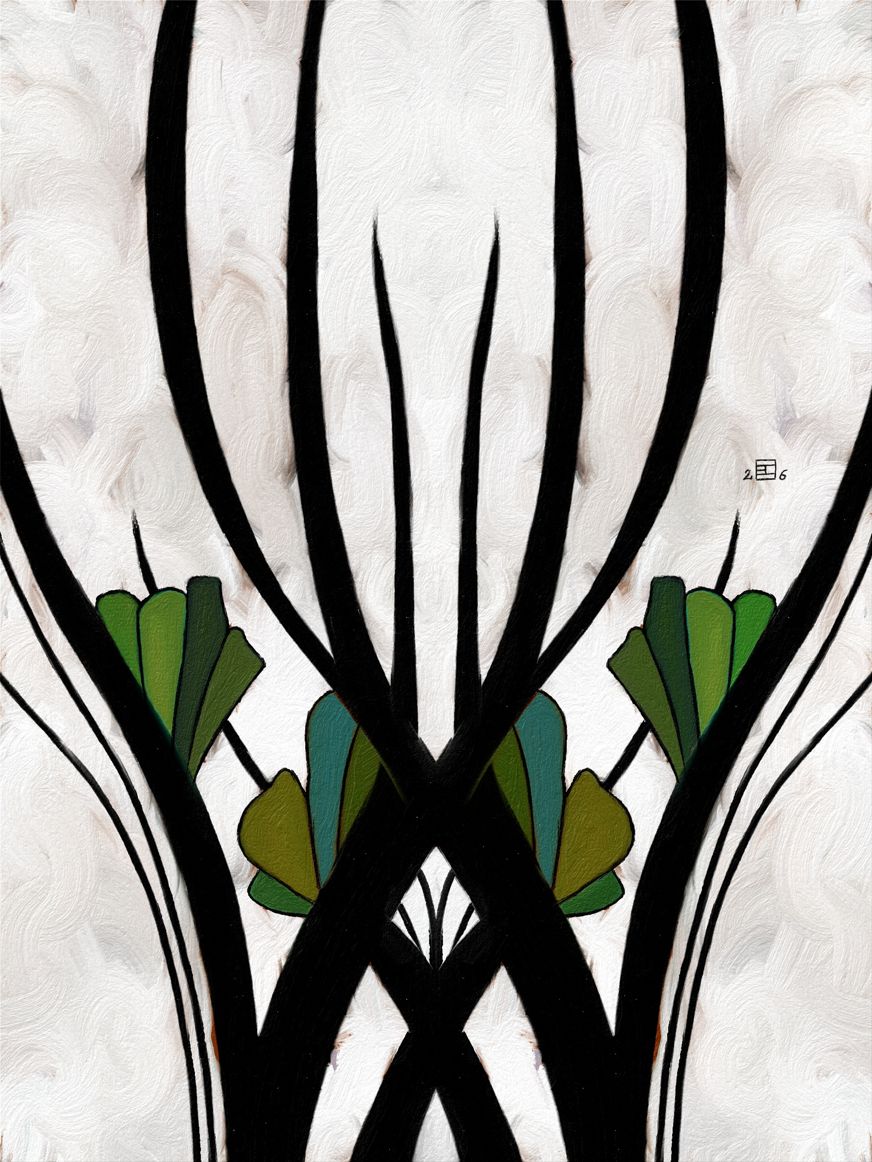 Ici je réunis mes passions: la peinture à l'huile, la symétrie, la géométrie et les tons verts. Depuis que j’ai commencé la peinture, une des difficultés était le vert. On dirait qu’avec l'âge j’ai réussi à la dominer.