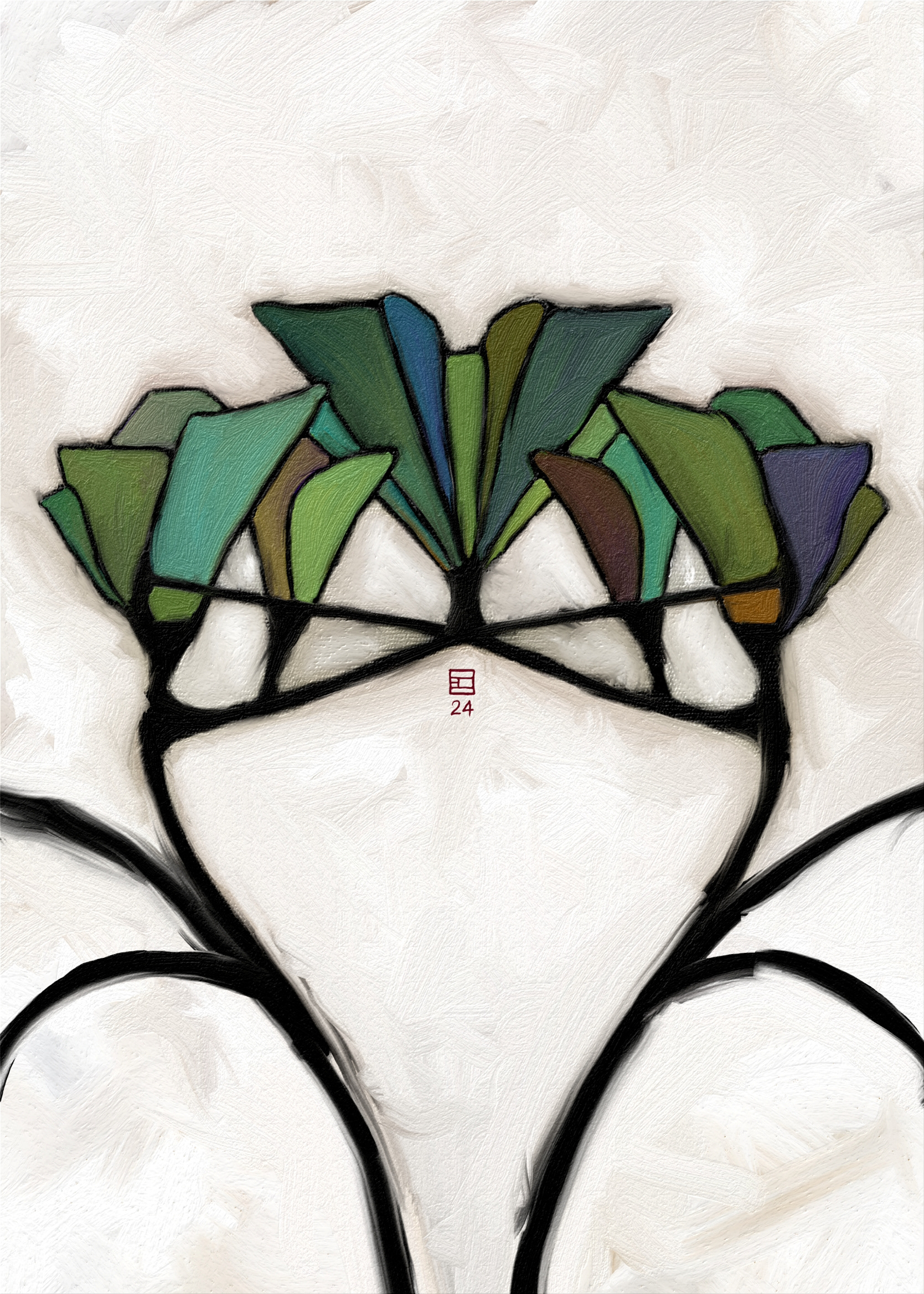 Collection d'œuvres d'art d'inspiration florale, chacune présentant une composition distincte sur un fond blanc texturé. Le style général est moderne et abstrait, mêlant précision géométrique et fluidité organique.
