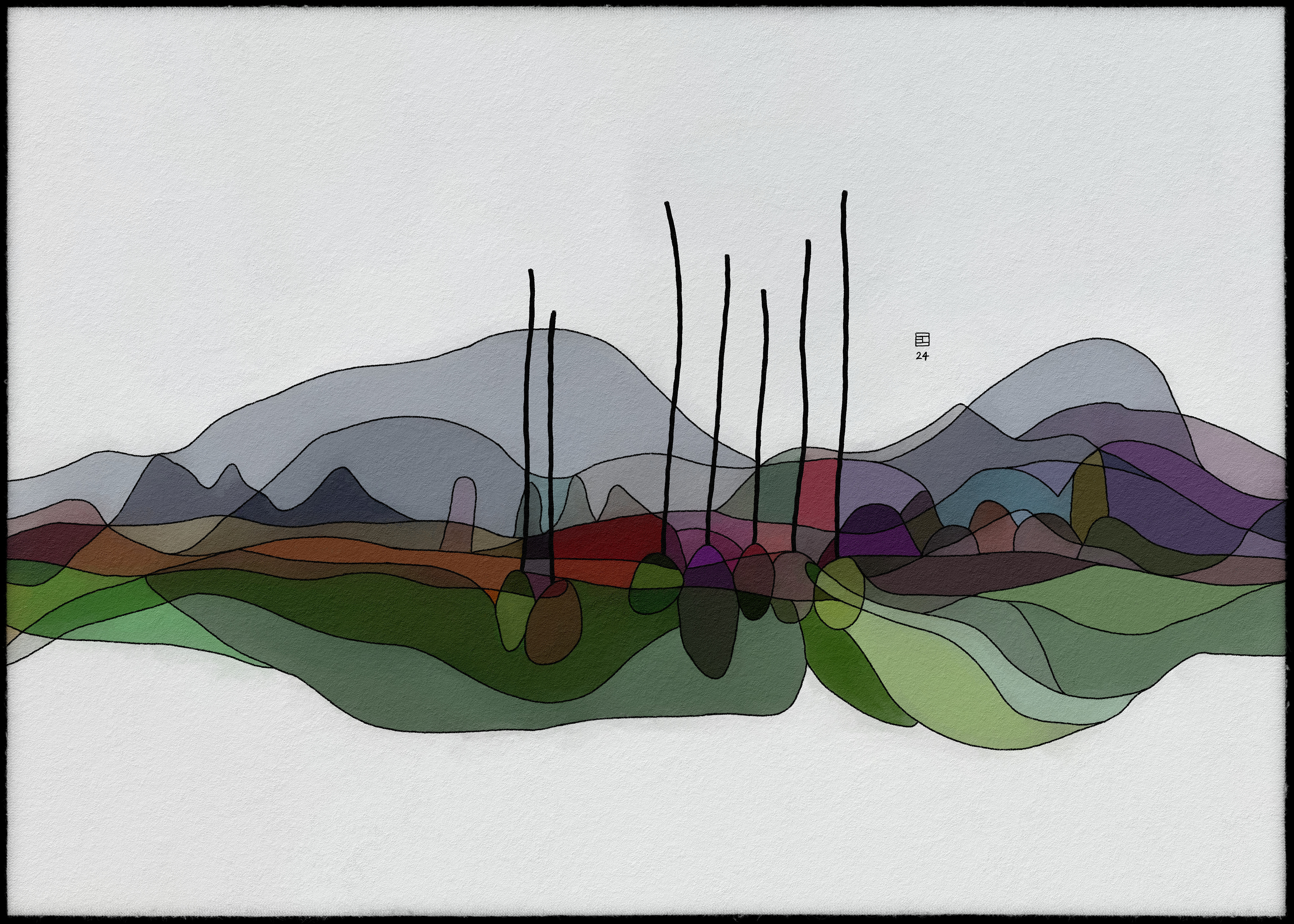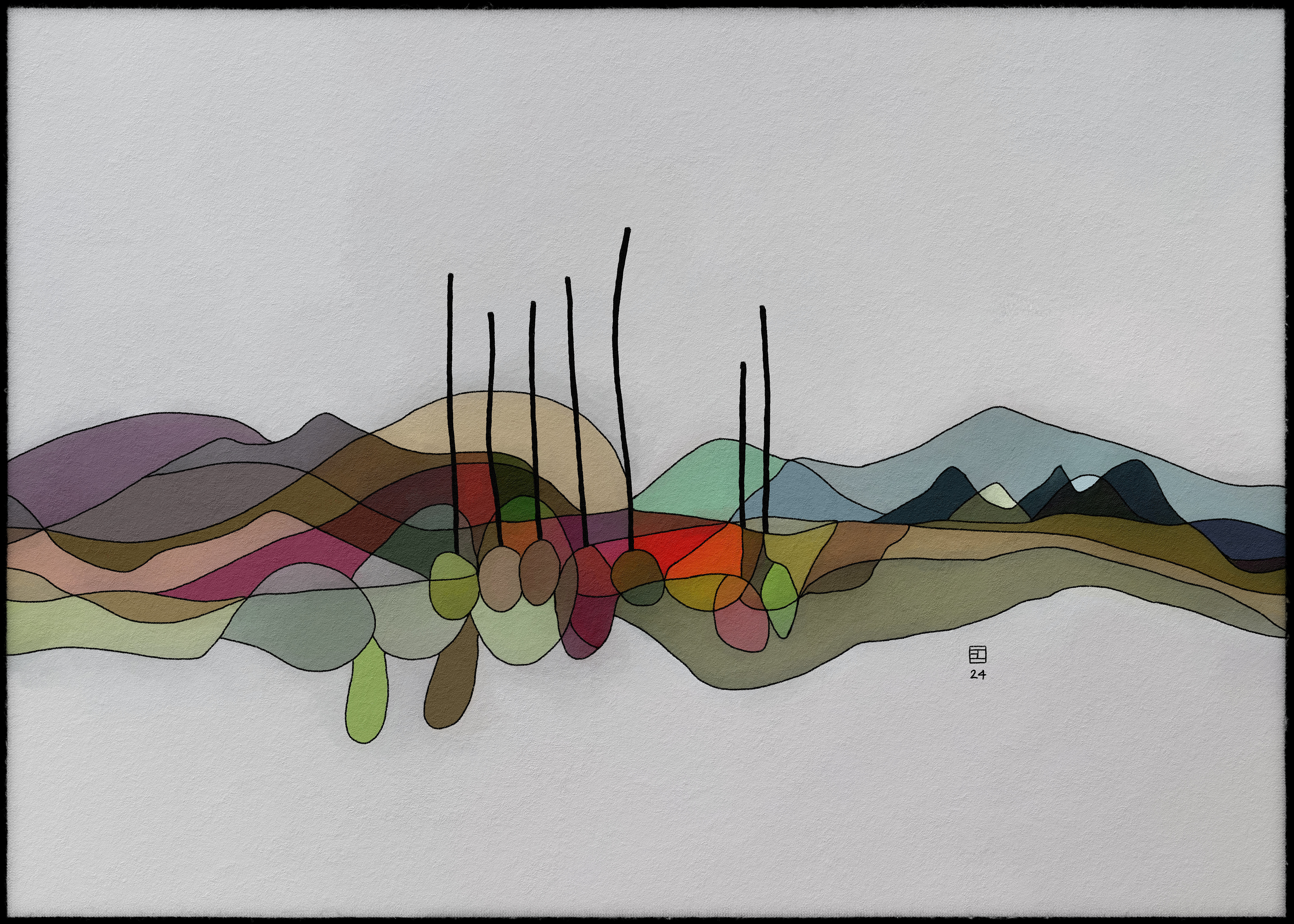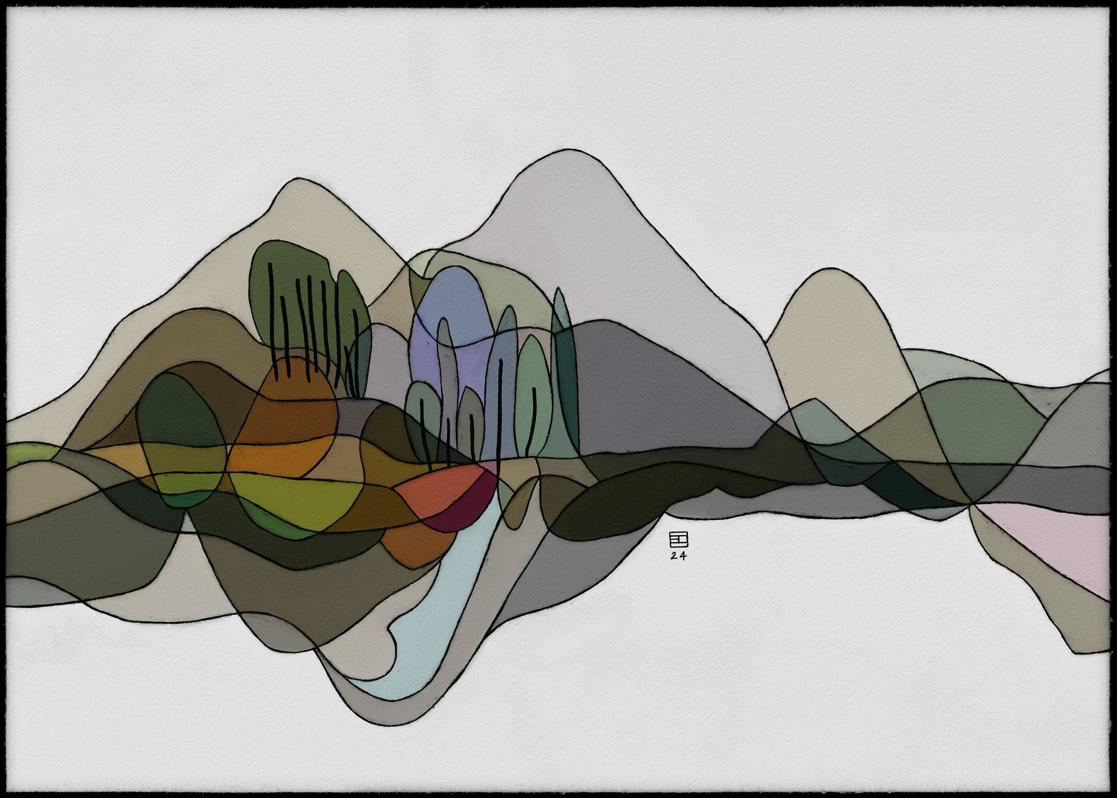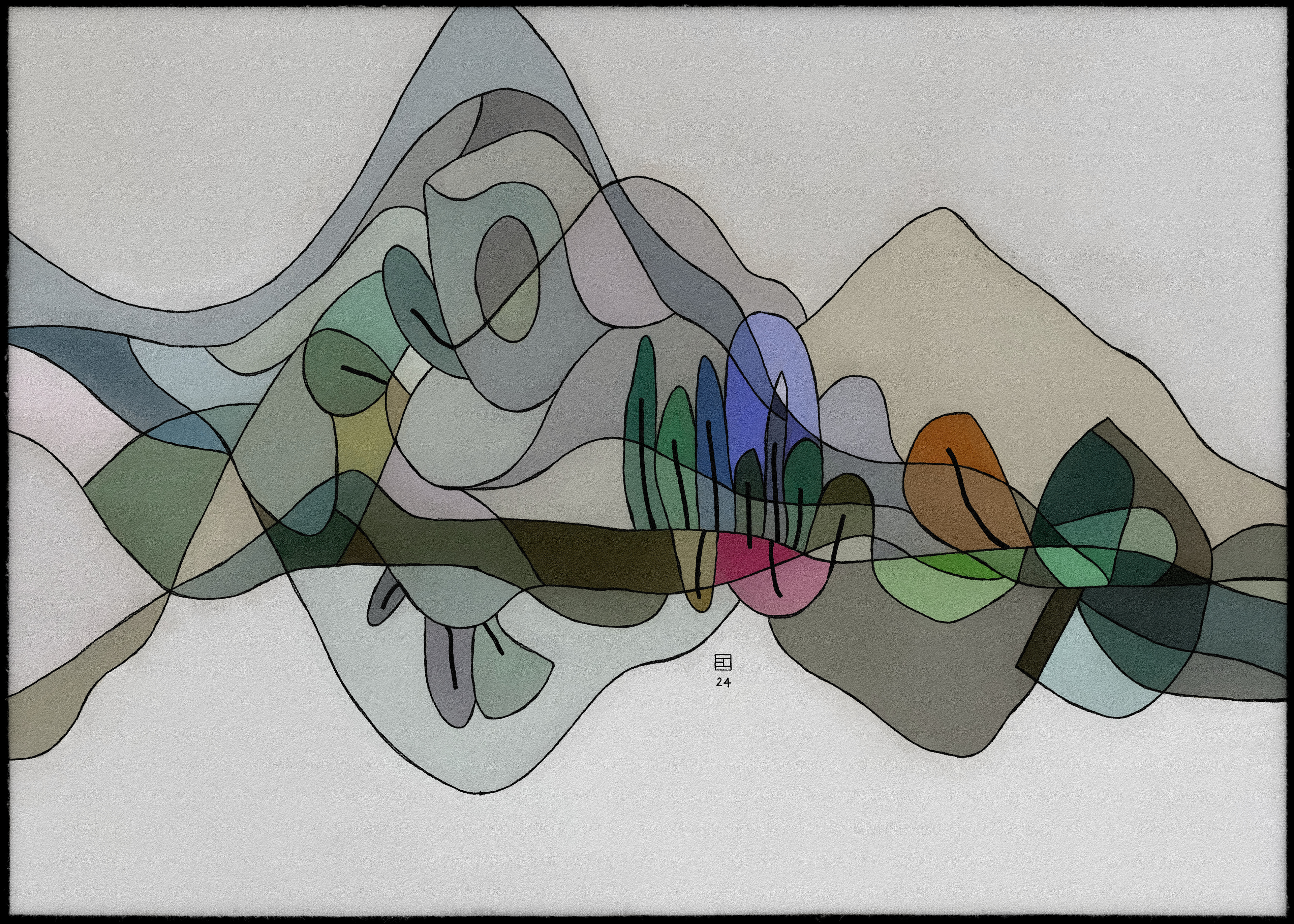 Cette collection d'art abstrait représente une série de paysages, chacun composé de couches de couleurs et de formes translucides. Les paysages sont rendus dans un style rappelant le vitrail, en mettant l'accent sur les variations de couleurs subtiles et les détails complexes. L'utilisation de formes superposées et de couleurs translucides crée une impression de profondeur et de mouvement, tandis que la composition globale évoque un sentiment de tranquillité et de sérénité. Les paysages évoquent des scènes naturelles, avec des notes de montagnes, d'arbres et d'eau, mais sont finalement abstraits et ouverts à l'interprétation individuelle. L'œuvre invite le spectateur à explorer l'interaction des couleurs, des formes et des textures, et à trouver sa propre signification dans l'équilibre délicat de la nature.