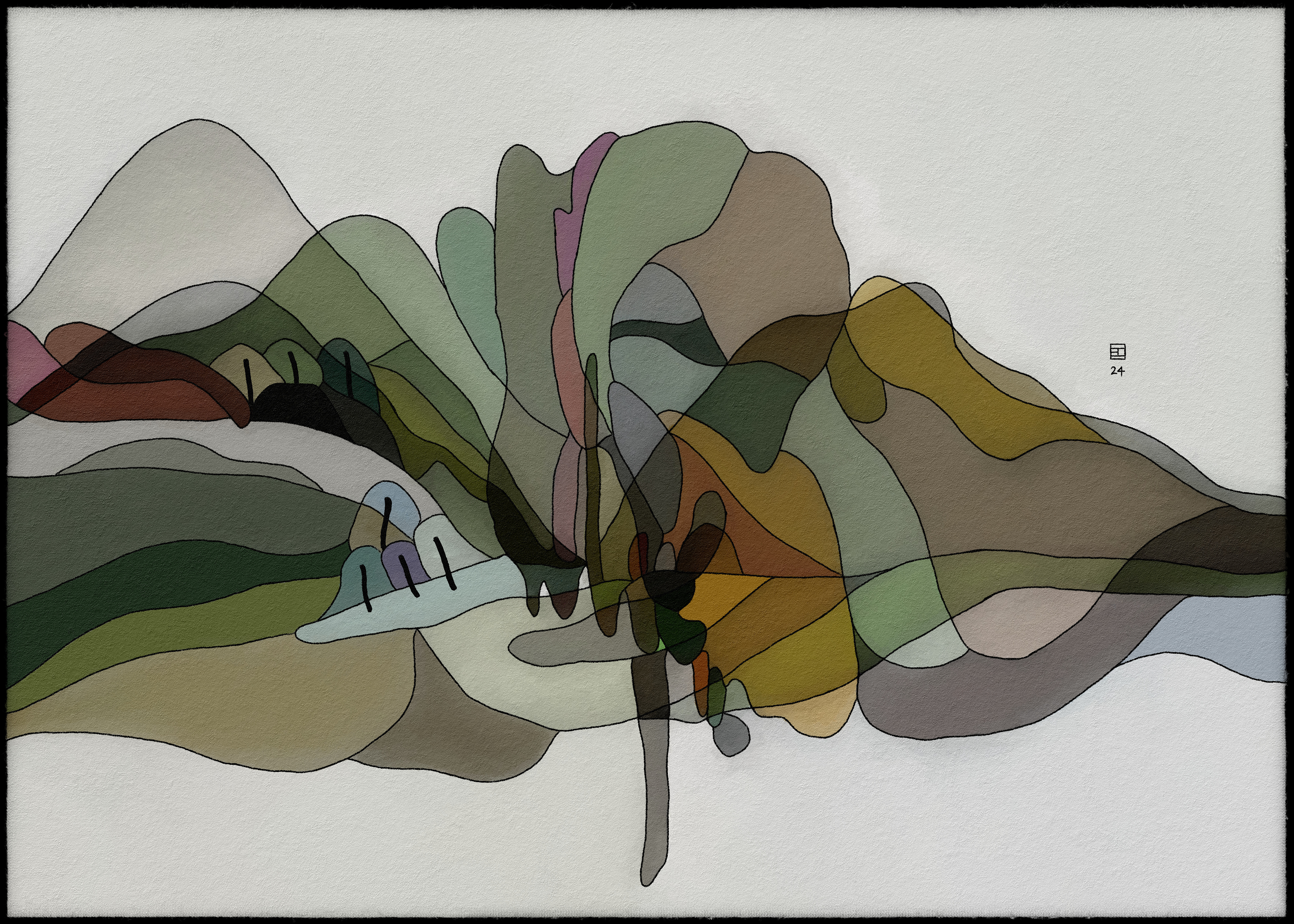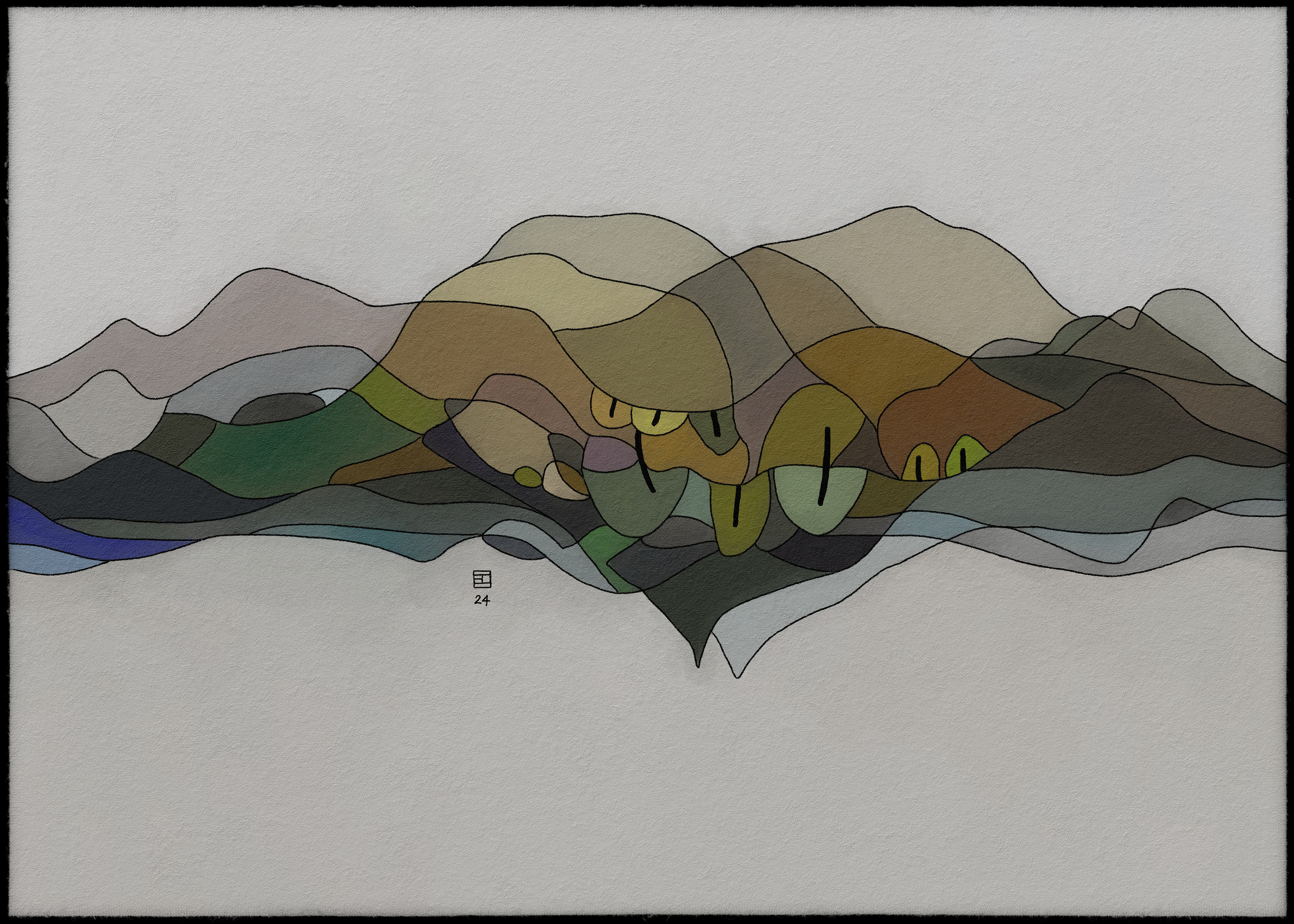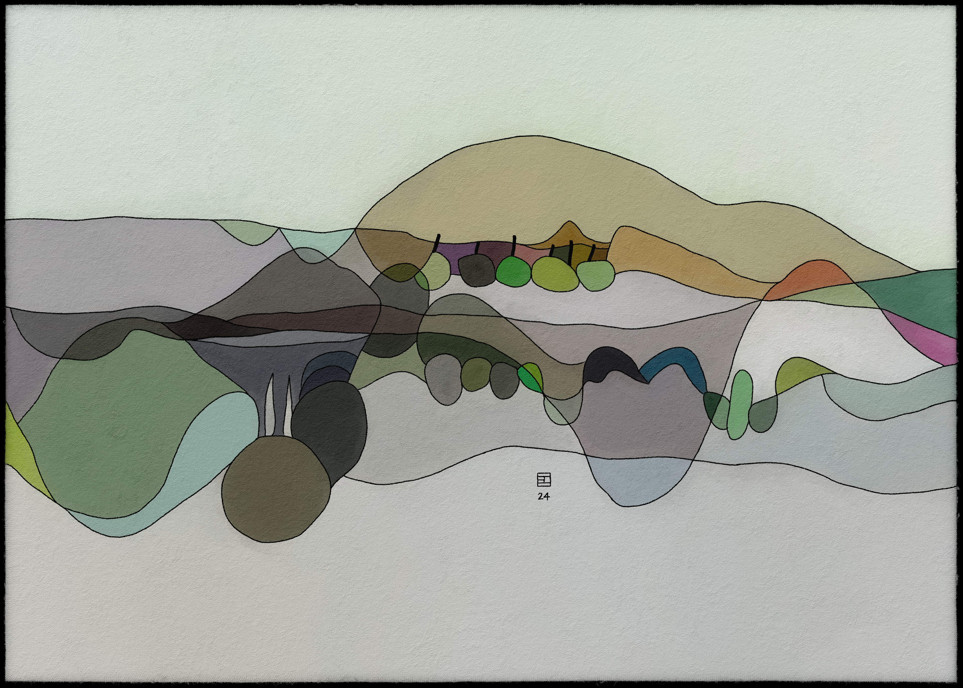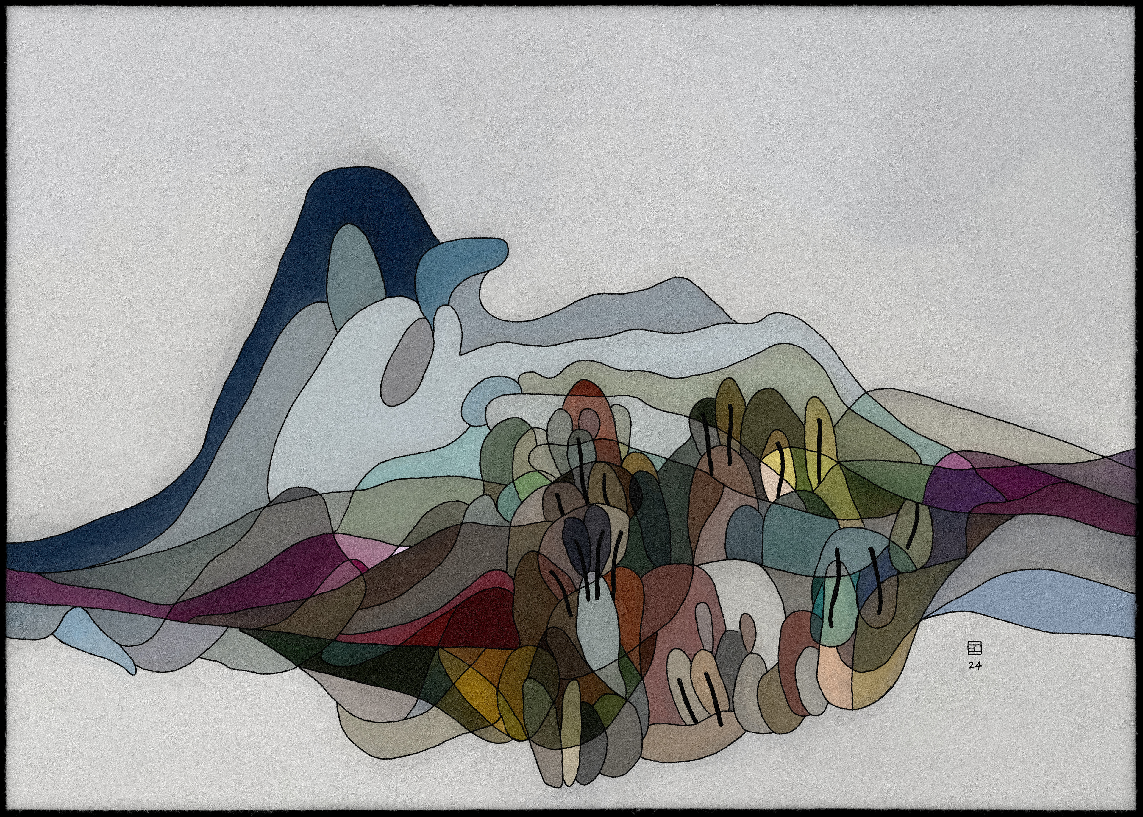 Cette collection d'art abstrait représente une série de paysages, chacun composé de couches de couleurs et de formes translucides. Les paysages sont rendus dans un style rappelant le vitrail, en mettant l'accent sur les variations de couleurs subtiles et les détails complexes. L'utilisation de formes superposées et de couleurs translucides crée une impression de profondeur et de mouvement, tandis que la composition globale évoque un sentiment de tranquillité et de sérénité. Les paysages évoquent des scènes naturelles, avec des notes de montagnes, d'arbres et d'eau, mais sont finalement abstraits et ouverts à l'interprétation individuelle. L'œuvre invite le spectateur à explorer l'interaction des couleurs, des formes et des textures, et à trouver sa propre signification dans l'équilibre délicat de la nature.
