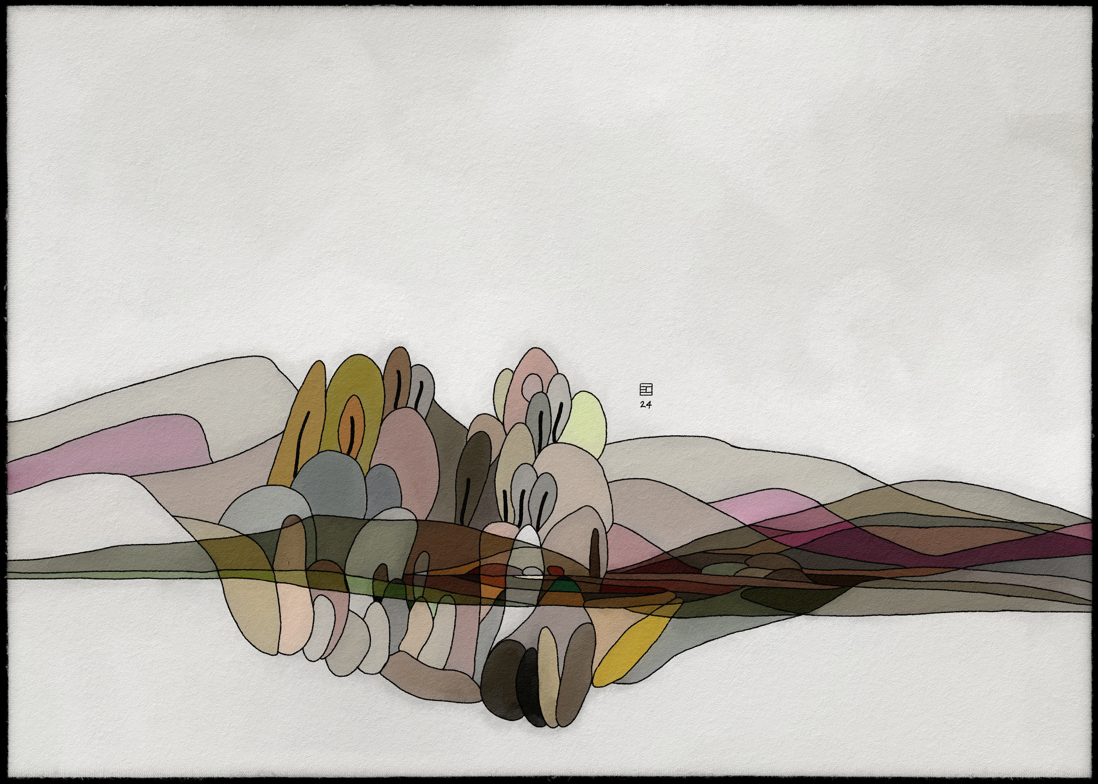 Une synthèse de paysages imaginaires en focalisant leurs couleurs et leurs formes. Un monde imaginaire flottant dans un espace pur qui lui donne un vrai pouvoir de dominance dans la nature.