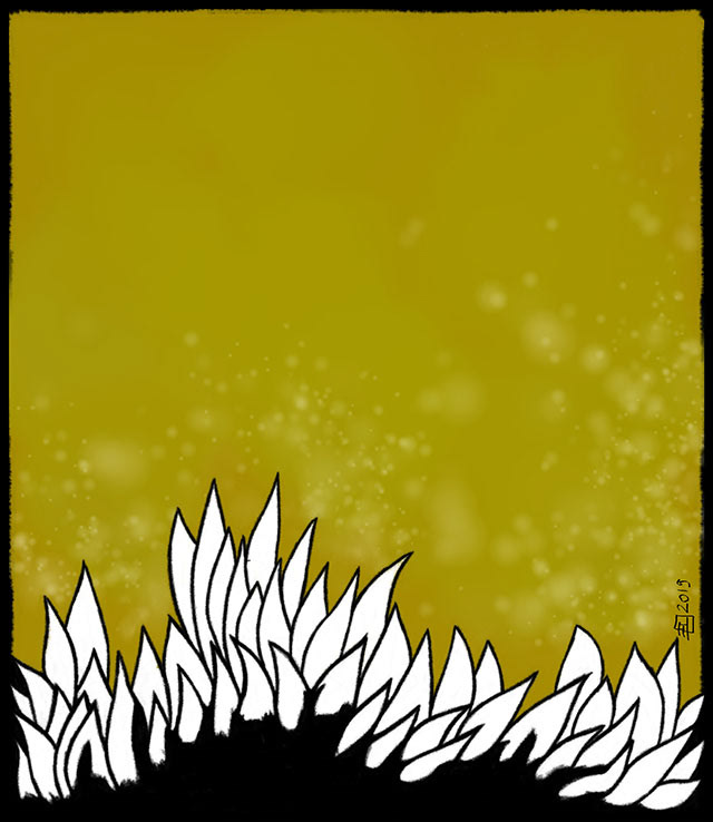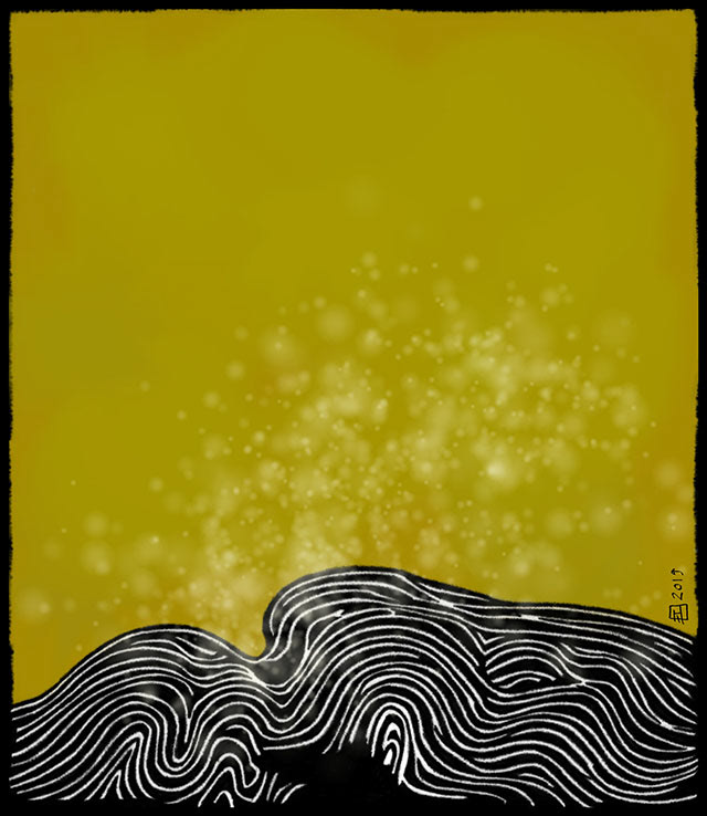 Des paysages imaginaires dans l’or d’un ciel jaunâtre éclatant. C’est comme si le soleil prenait tout le ciel et sa splendeur.